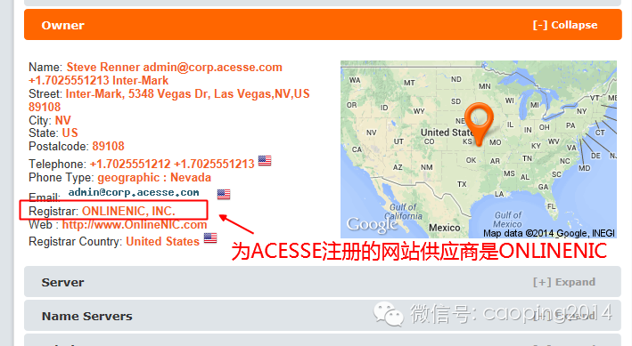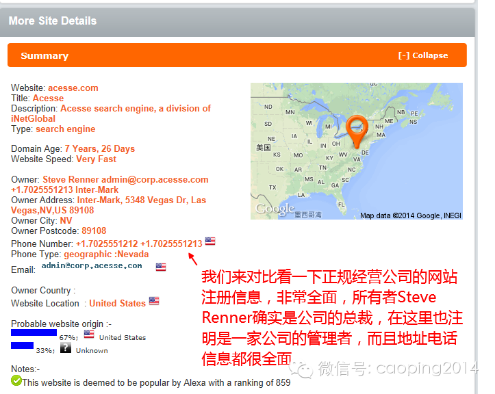 那么我们再看一下其他正规公司的网站查询结果做个对比吧,拿www.acesse.com举例:查询结果非常全面,包括网站所有者就是公司总裁